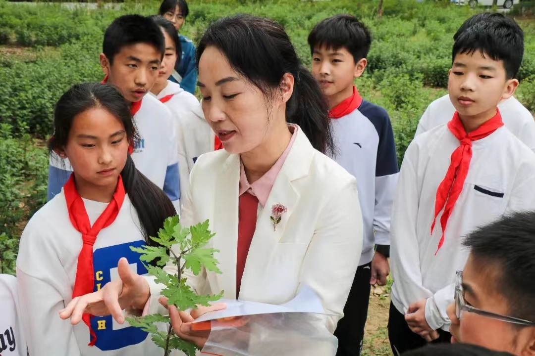 副教授周艳的带领下开启了探寻菊花田之旅。周艳通过趣味问答的方式向学生们介绍了菊花的品种、分类、生长过程、栽培方式、药用功效。学生们欣喜无比,纷纷下地参与实践活动,在活动中锻炼了动手能力、增强了生活劳动实践经验、全面了解了菊花知识。菊花黄澄澄圆滚滚,坠弯了花枝条,整个花田都是清香的味道,在欢声笑语中大家进行合影留念。