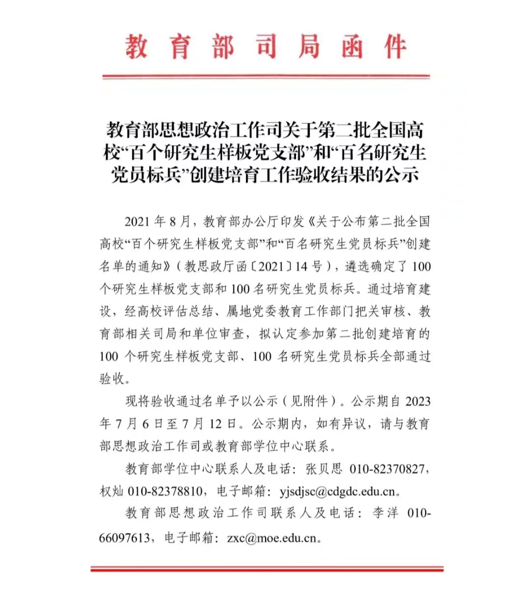 本网讯(通讯员 朱瑞萍 武梦蕊)近日,教育部思想政治工作司、教育部学位与研究生教育发展中心发布《关于第二批全国高校“百个研究生样板党支部”和“百名研究生党员标兵”创建培育工作验收结果的公示》。91吃瓜