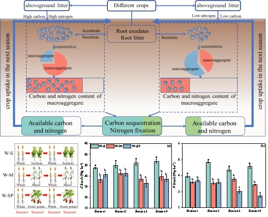 本研究明确了种植模式对土壤团聚体形成及其对SOC和TN的储存的影响。建议在黄淮海平原采用以豆类为基础的轮作系统,特别是冬小麦-大豆的种植模式,为进一步改善土壤结构和增加SOC和TN含量,减少温室气体排放潜力,进而为实现黄淮海平原农业可持续发展提供理论依据。