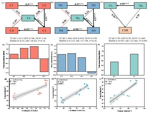 图2. 结构方程模型解析团聚体碳氮含量与土壤SOC和TN固存的关系