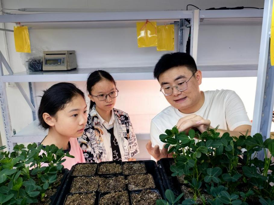耕作生态与中药方向研究生党支部党员曹增辉带领同学们走进花生功能基因组学实验室,向同学们介绍了花生的起源和发展,并让同学们品尝了课题组培育的优质花生,带领大家了解课题组现有仪器设备,最后参观了室内人工气候室并介绍了花生的形态特征以及在室内的不同栽培方式。