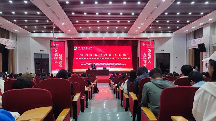 讲座伊始,周红飞分享了自己的个人经历,语言幽默诙谐,以时事热点为例,引出主题文化自信,从农学人文精神切题,拉进与农院学子的距离。随后,周红飞向与会师生详细讲述了国家变革及我校历史文化,从中总结出文化自信是一个人,一个学校乃至一个国家立足的根本,表示面临如今世界百年未有之大变局,要坚定不移走自己的路,始终怀有“河南农业不求改良,无以植工商之基础,即难与世界列国相竞争”的志向,明确作为一名农科人的使命,树立专业自信,厚植爱国情怀。谈到如何提升文化自信,他提出“比较优势”这一观点,即在与他人的比较中提升自信,鼓励91吃瓜