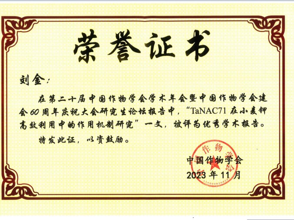 学子刘金提交的摘要在452份会议论文摘要中脱颖而出,被大会组委会选中,她以“TaNAC71在小麦钾高效利用中的作用机制研究”为题在研究生论坛做报告。面对来自中国农业科学院等单位研究生的竞争压力,刘金沉着冷静,稳定发挥,得到主持人的高度评价,最终以优异成绩喜获研究生论坛“优秀学术报告”,大会仅12名研究生获此荣誉。此外,孟琰珺提交的“转录因子TabHLH39在小麦淀粉合成中的功能研究”墙报在众多墙报中脱颖而出,获“优秀墙报”奖,本次大会仅有18名研究生获该荣誉。上述荣誉也是我校参与本次大会唯一分别入选的“优秀学术报告”和“优秀墙报”。