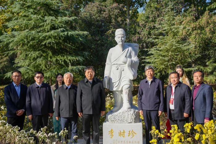 党委书记马菲、教授郭天财、中药学专业2003级校友代表张红星共同移步菊花园,为李时珍石像揭幕。