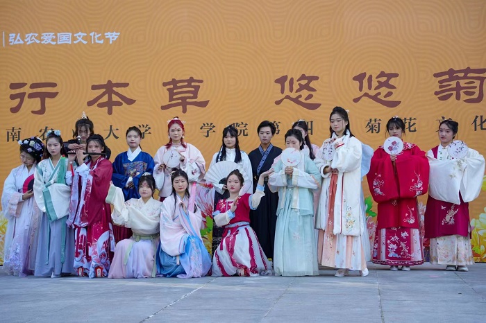 中药学专业学生亲手种植的菊花在“知行本草”菊花园中争奇斗艳、各展娇姿。本届菊花文化节在学院青禾艺术团精彩的表演中拉开帷幕。他们身上的汉服散发古韵,随着菊香飘舞,舞姿优美动人,在故事情节的串联下仿佛跨越千年,将菊花与汉服表演巧妙融合,为现场观众带来一场视觉盛宴。