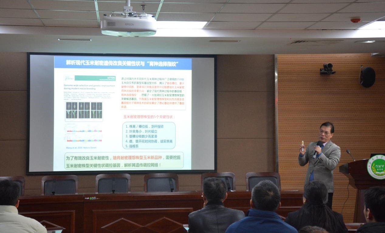 报告会上,王海洋教授主要介绍了玉米自交系耐密育种改良关键性状与“育种选择指纹”的鉴定,接着,解析了耐密植、抗倒伏调控基因的挖掘方法,玉米杂优群形成与演化的规律以及玉米杂种优势形成机理,最后,结合自己的研究经历,介绍了现代玉米育种新技术 。