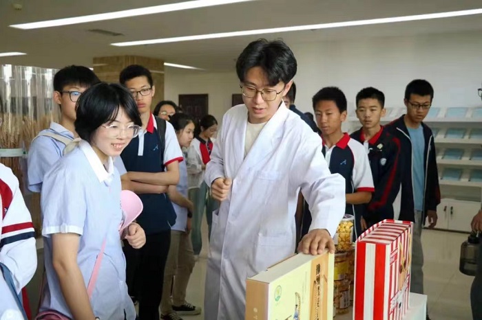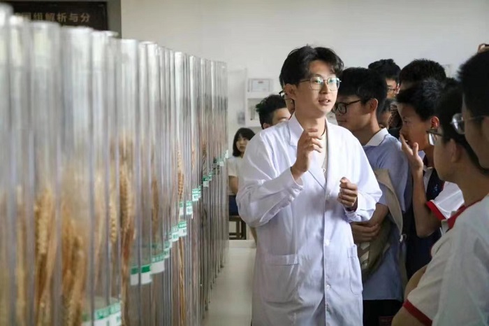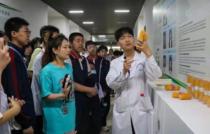 活动的第一站来到省部共建小麦玉米作物学国家重点实验室。刚到实验室门前,来访学生就被桌子上摆放着的各类玉米品种所吸引。研究生杨泽源从籽粒形态、性状、推广及应用等方面为来访学生进行介绍,并为来访学生讲述了“南繁北育”的开创者—吴绍骙先生投身农业科研、开展科技创新的故事。随后,来访学生来到了四楼的作物品种展厅进行参观,研究生高义翔从小麦的穗、籽粒颜色入手,为来访学生进行讲解,来访学生上前仔细观察小麦的形态并提出自己的疑问。
