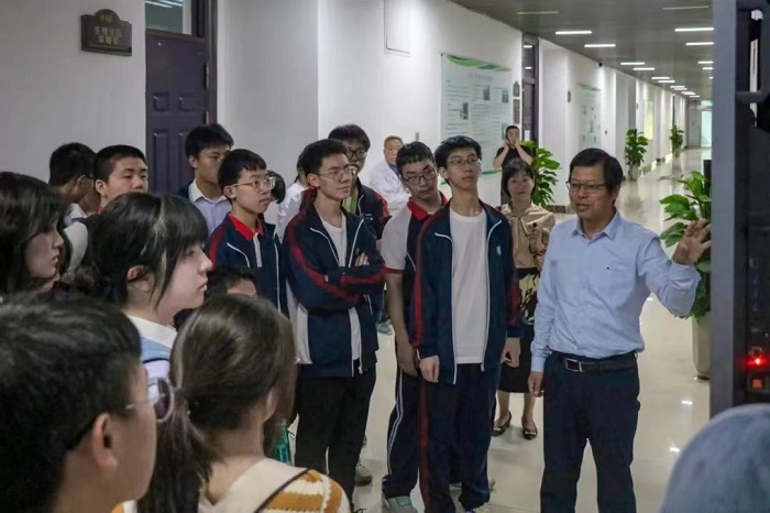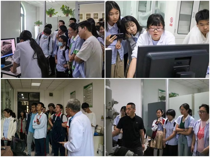 在大型仪器测试运营中心,来访学生观看了我校120周年校庆宣传片,随后在老师的带领下参观了显微操作平台和质谱平台。面对从未见过的仪器,来访学生仔细聆听黄晓书、赵凯和贾美玲三位老师的讲解,并结合自己所学的化学和生物学知识与老师进行交流。