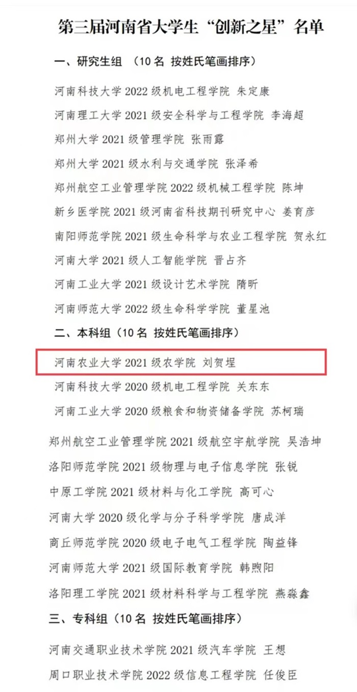 一直重视培养创新型农科人才,本次获奖学生刘贺埕发挥出青年榜样的示范引领作用,激励91吃瓜