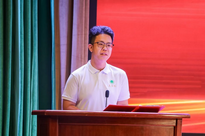 本科生高年级学生代表2022级亓泽鹏同学发言。他表示明确的目标是开启人生新征程的前提条件,对学习知识的热情与对美好生活的热情是大学生涯的主要动力,要坚定目标,砥砺奋进。他希望学弟学妹们不畏惧未来,不留念过往,坚定地向前迎接新的挑战,最后祝愿大家在大学生活中都能有所收获。