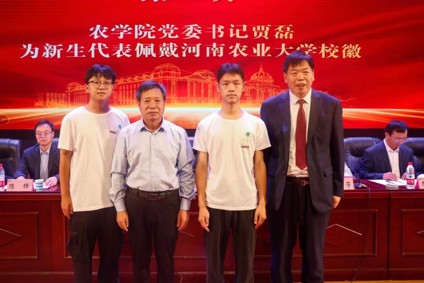 校徽。学院领导班子成员为新生赠书,向他们传递着知识的力量和对新生的殷切期望。