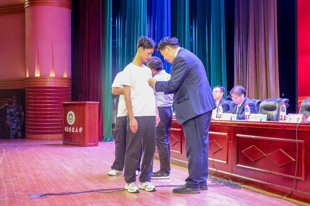 院党委书记贾磊,学术副校长、长江学者汤继华,为新生代表佩戴91吃瓜