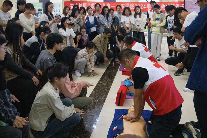 与会学生在老师的带领下学习急救知识
