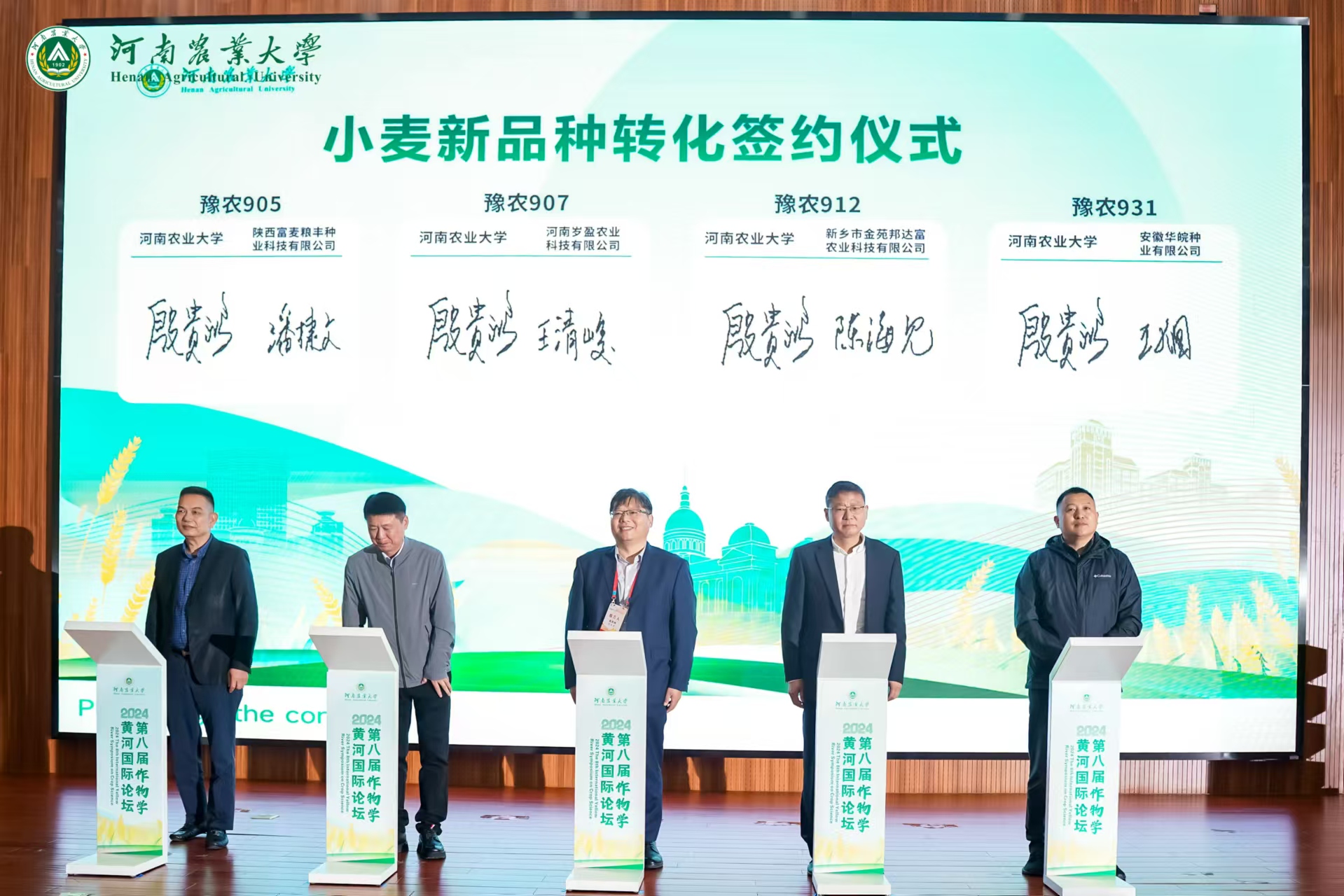 小麦新品种选育团队殷贵鸿分别与陕西富麦粮丰种业科技有限公司、河南岁盈农业科技有限公司、新乡市金苑邦达富农业科技有限公司、安徽华皖种业有限公司企业代表现场进行签约。本次签约包括豫农907、豫农905、豫农912、豫农931四个小麦新品种转让经费总计1040万元。