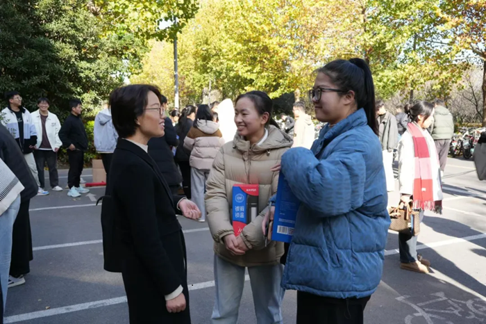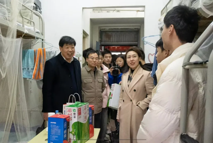 随后,学院领导走进宿舍与学生深切交流,并将考研大礼包亲手送到学生手上。贾磊亲切地慰问考研同学,悉心询问了同学们近期的课程复习情况,叮嘱同学们一定要注意劳逸结合,以轻松愉悦的心态迎接考研。