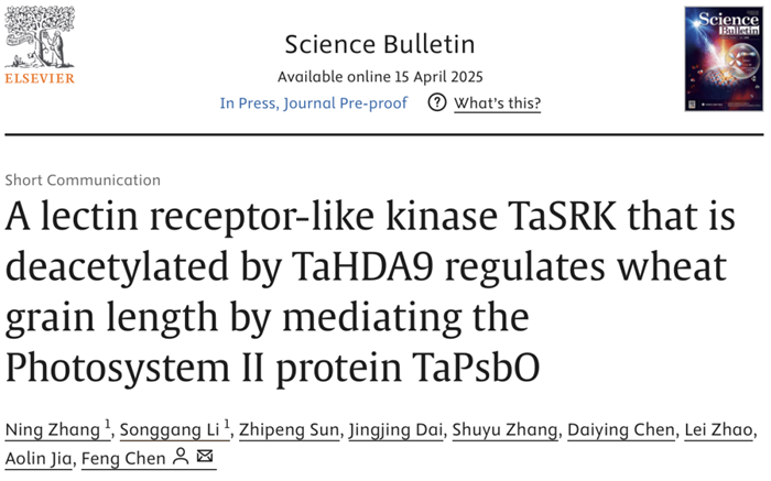 陈锋教授团队在Science Bulletin(即时IF=20.6)发表了题为“A lectin receptor-like kinase TaSRK that is deacetylated by TaHDA9 regulates wheat grain length by mediating the Photosystem II protein TaPsbO”的研究论文。该研究在小麦中克隆到一个负向调控小麦籽粒长度的关键基因TaSRK, 并解析了TaHDA9-TaSRK模块通过介导光系统II中的TaPsbO调控小麦籽粒长度的分子机制。