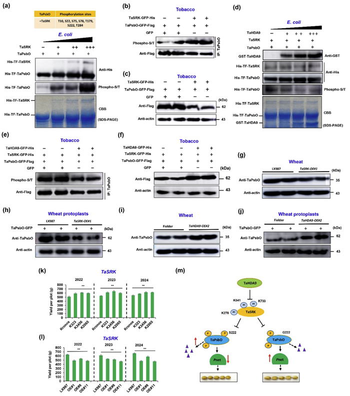 为了挖掘小麦籽粒大小调控基因,本研究对349份小麦材料进行了多年多点的籽粒大小和千粒重调查,通过GWAS分析确定一个多环境显著的Block、该区间包含了11个候选基因,并进一步结合EMS突变体库、转录表达和小麦Pan800K的基因测序信息等锁定TaSRK为关键候选基因(图1b-c),该基因存在4种单倍型,其中TaSRK-Hap1的粒长和千粒重显著较高。连续3年田间数据显示,TaSRK过表达转基因小麦粒长变短、千粒重显著下降,而突变体则显示粒长变长、千粒重显著上升(图1d-i)。以TaSRK蛋白为诱饵,通过酵母双杂交筛选小麦cDNA文库,确定了一个组蛋白去乙酰化酶TaHDA9。实验证实TaSRK和TaHDA9存在蛋白互作。体外和半体外去乙酰化实验均证实TaHDA9直接去乙酰化TaSRK的2个赖氨酸位点K541和K733,并由此降低其蛋白积累(图1j-m)。2022-2024连续3年农艺性状调查结果表明,TaHDA9过表达转基因小麦籽粒变长、千粒重显著增加,而突变体籽粒变短、千粒重显著下降。