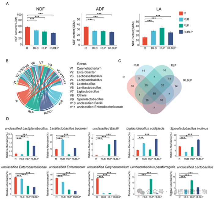 本研究通过混合青贮技术,将FGR与玉米或高丹草按不同比例(75:25、50:50等)进行共发酵,结合代谢组学与微生物组学分析,揭示了FGR与玉米混合青贮的发酵机制及品质调控规律。研究发现,FGR与玉米以75:25比例混合时,中性洗涤纤维(NDF)和酸性洗涤纤维(ADF)含量分别降至44%和24%,乳酸浓度达39.37 g/kg DM,显著优于与高丹草混合组。玉米的碳水化合物补充与缓冲能力有效调节了发酵环境。混合体系富集了乳杆菌科和芽孢乳杆菌科等有益菌群,抑制了有害微生物增殖。接种植物乳杆菌可进一步提升乳酸/乙酸比至3.5,pH稳定在4.0以下,显著增强青贮稳定性。研究阐明了FGR-玉米混合体系通过微生物实现纤维素高效降解的代谢网络,为精准调控青贮发酵提供了理论依据。