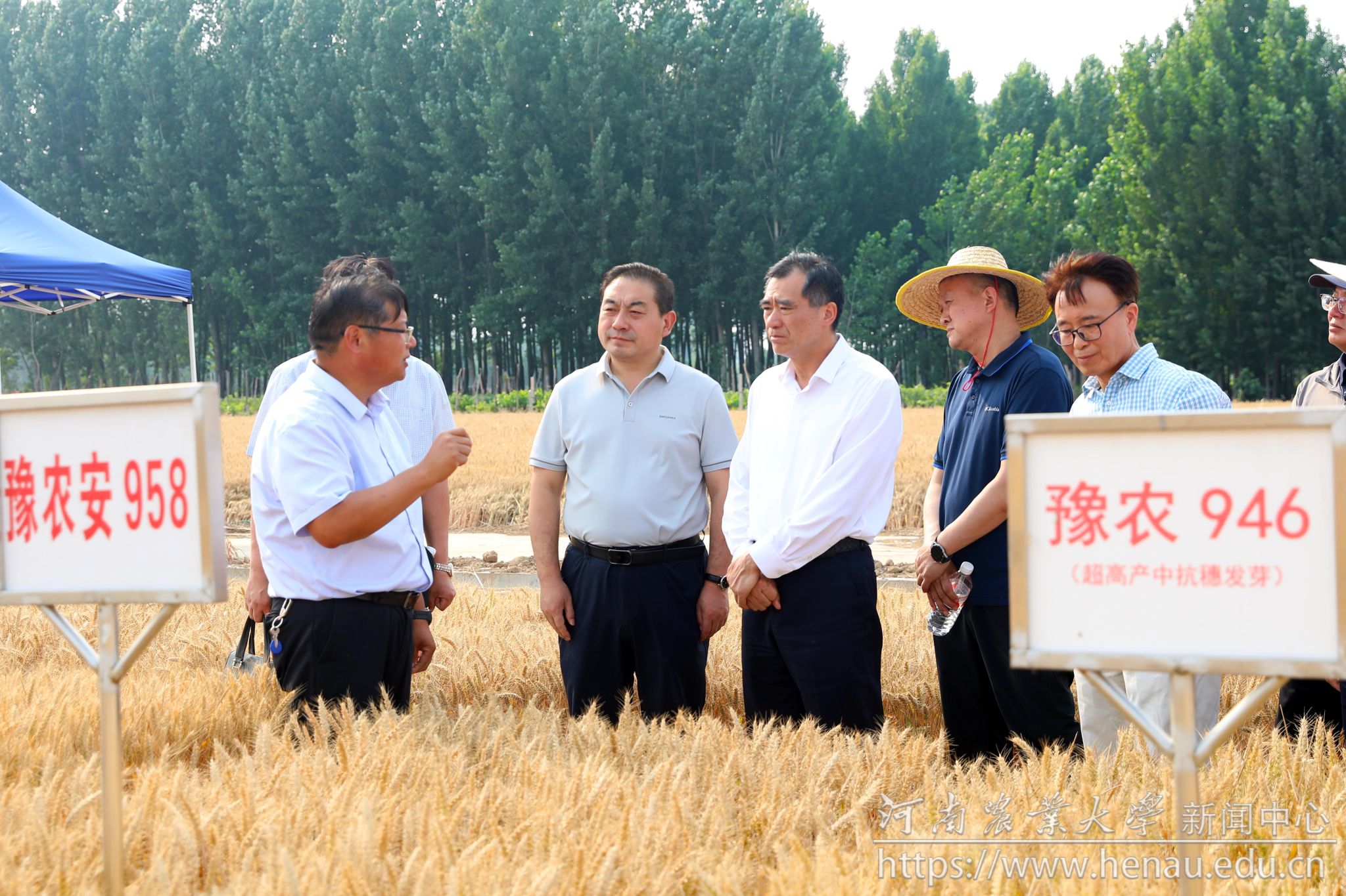 副院长殷贵鸿分别介绍了我校锚定“四个面向”,进行小麦育种技术创新取得的最新科研进展。岳杰勇实地查看了我校选育的“豫州5108”“豫州473”“豫农912”“豫农916”“豫农931”“豫农946”等“豫州”“豫农”系列小麦新品种田间表现,详细了解新品种的产量潜力、品质特性和抗逆能力,以及在大面积示范推广中的实际效果;与何才文、张道明等围绕加速我校小麦新品种科研成果转化、创新良种推广合作模式、共同服务国家粮食安全、联合申建国家级科研创新平台等进行了交流。