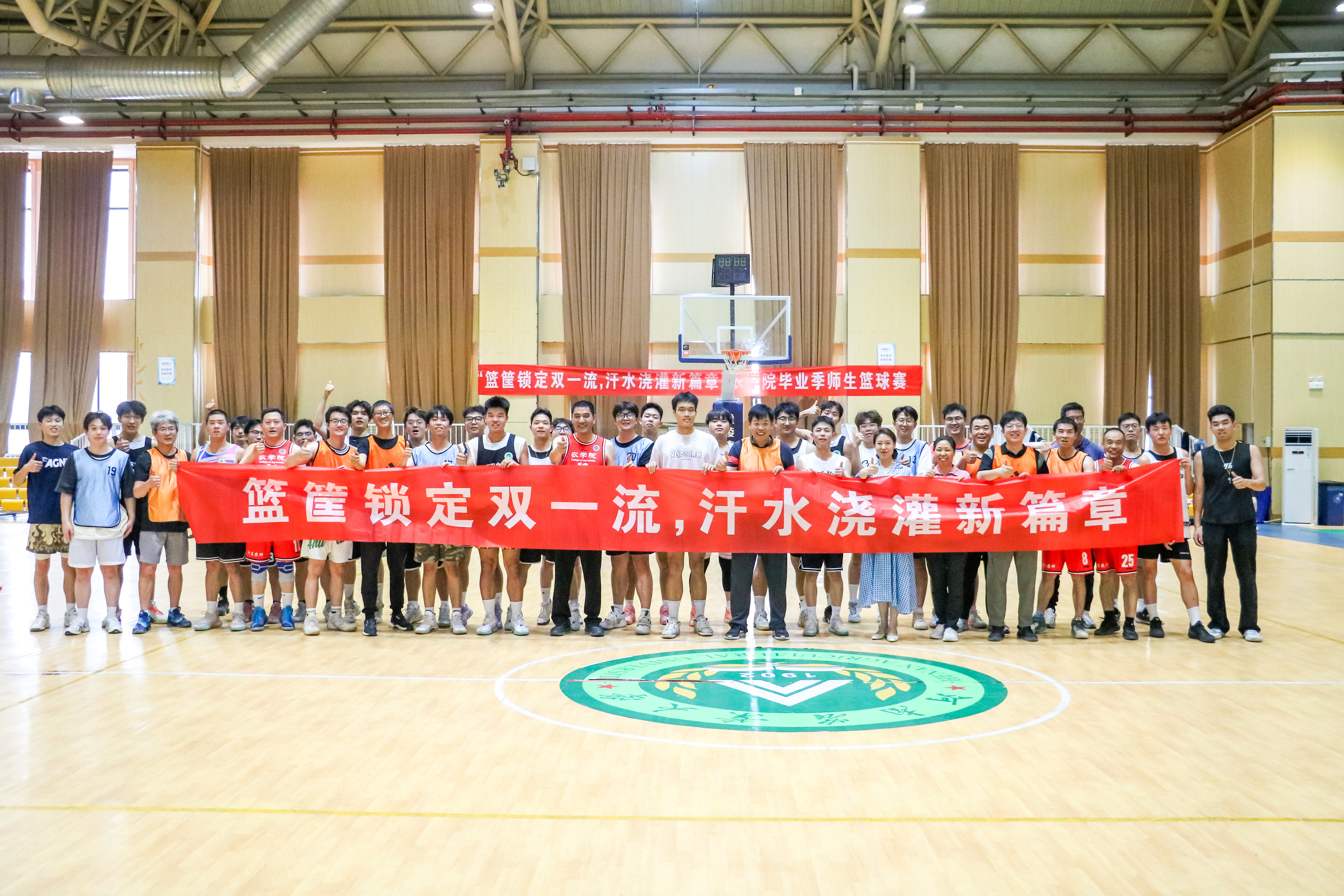 在体育馆二楼举办 “篮筐锁定双一流,汗水浇灌新篇章” 毕业季师生篮球友谊赛。院党委书记贾磊、院党委副书记方芳、副院长李浩贤,毕业生辅导员唐朝等众多师生齐聚一堂,共同见证这温馨又热血的时刻。
